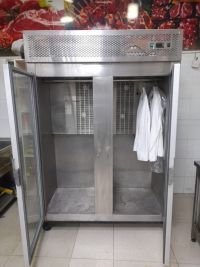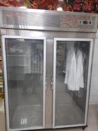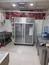 ثلاجة عرض احترافية مخصصة لعرض وحفظ اللحوم الطازجة، تأتي بتصميم زجاجي مزدوج مع بابين شفافين لعرض مثالي. مزودة بعام ود تعليق ستانلس ستيل لتعليق اللحوم بشكل منظم واحترافي. هيكل خارجي وداخلي من الفولاذ المقاوم للصدأ لضمان النظافة والمتانة في بيئات العمل التجارية. مزودة بشاشة رقمية للتحكم الدقيق بدرجة الحرارة، مع عجلات سفلية لسهولة الحركة والنقل
