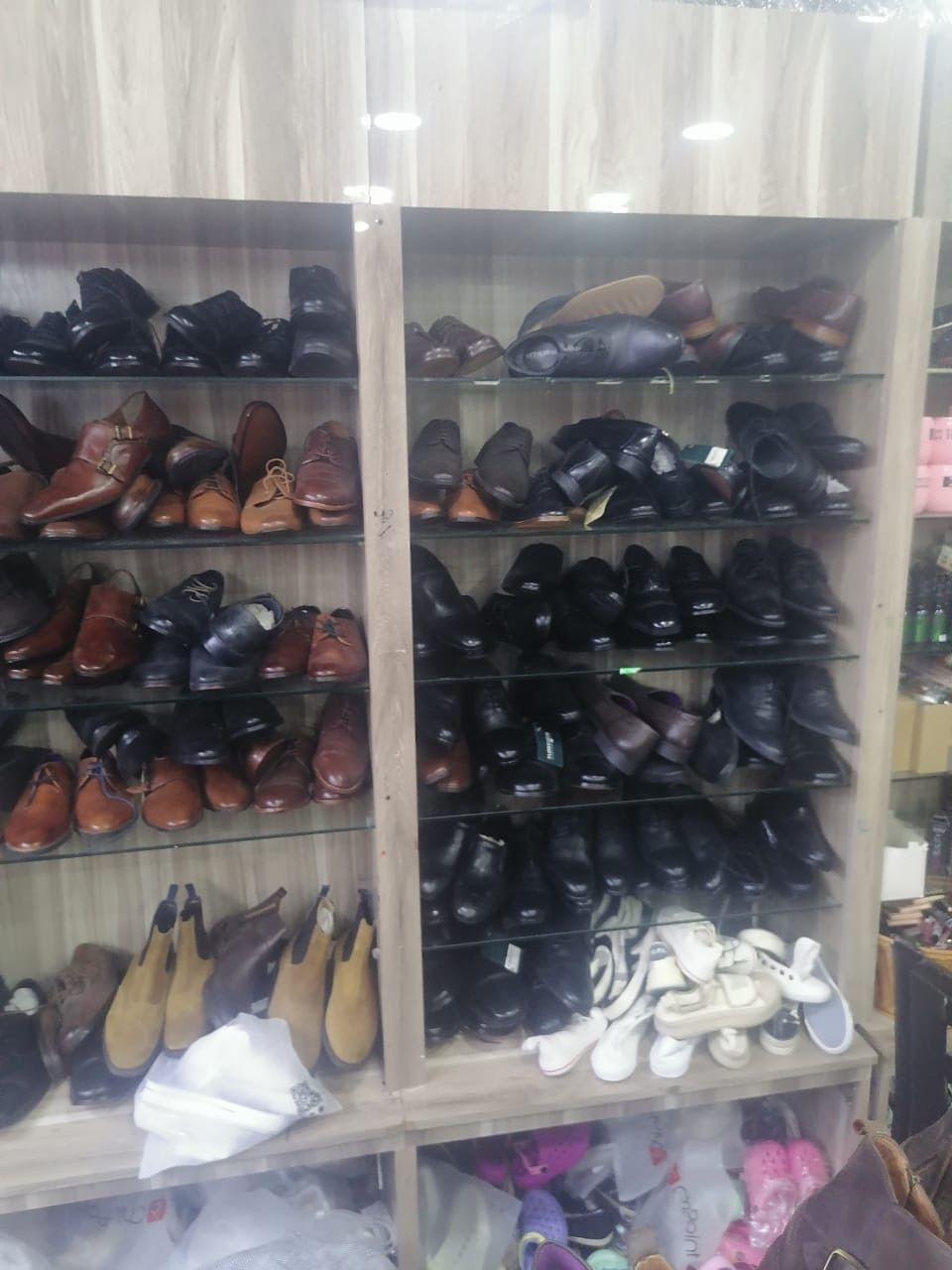 16 - meter - long wooden shelves with glass tops, available in white and brown, in excellent condition, only 3000 dirhams