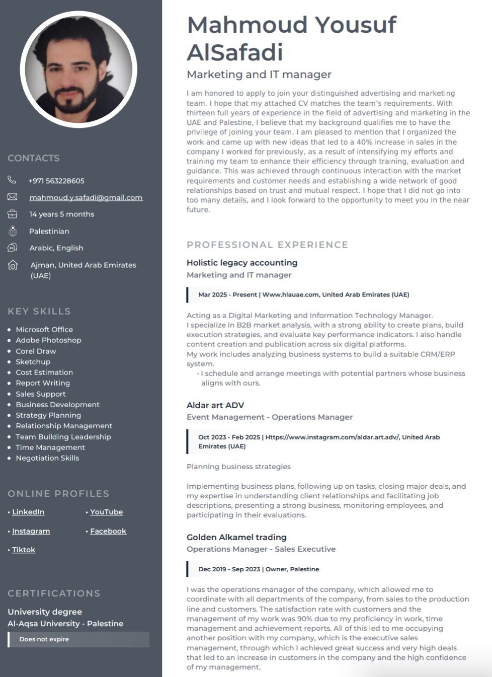 Mahmoud AlSafadi, I've leicene drive, Emirate of RAK UAE Practical experience in the field of managing operations following up on tasks and developing advertising companies. Technical experience manufacturing illuminated signs of all kinds, figures shields, and special gifts using design programs organizing Events and experience in sales practical experience in all department