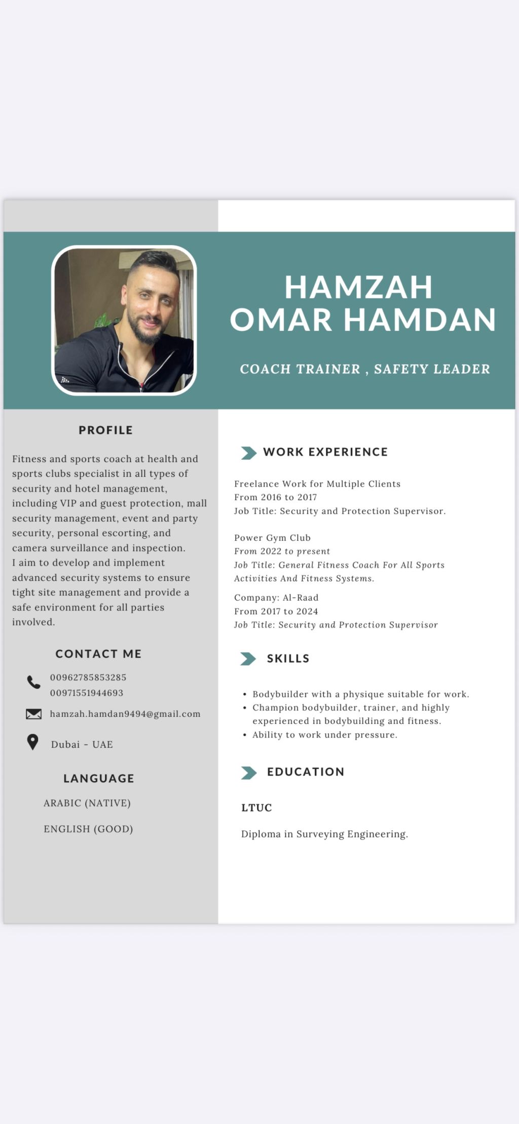 مهتم بعمل في مجال الأمن وحماية والمرافقات الشخصية والحراسات وأملك شهادة خبرة من أكبر شركة أمن وحماية في الأردن ومدرب كمال أجسام حائز على بطولات محلية وأملك شهادات خبرة وتكريم من الأندية والاتحاد الأردني العمر 30 الطول 1.87 الوزن 95