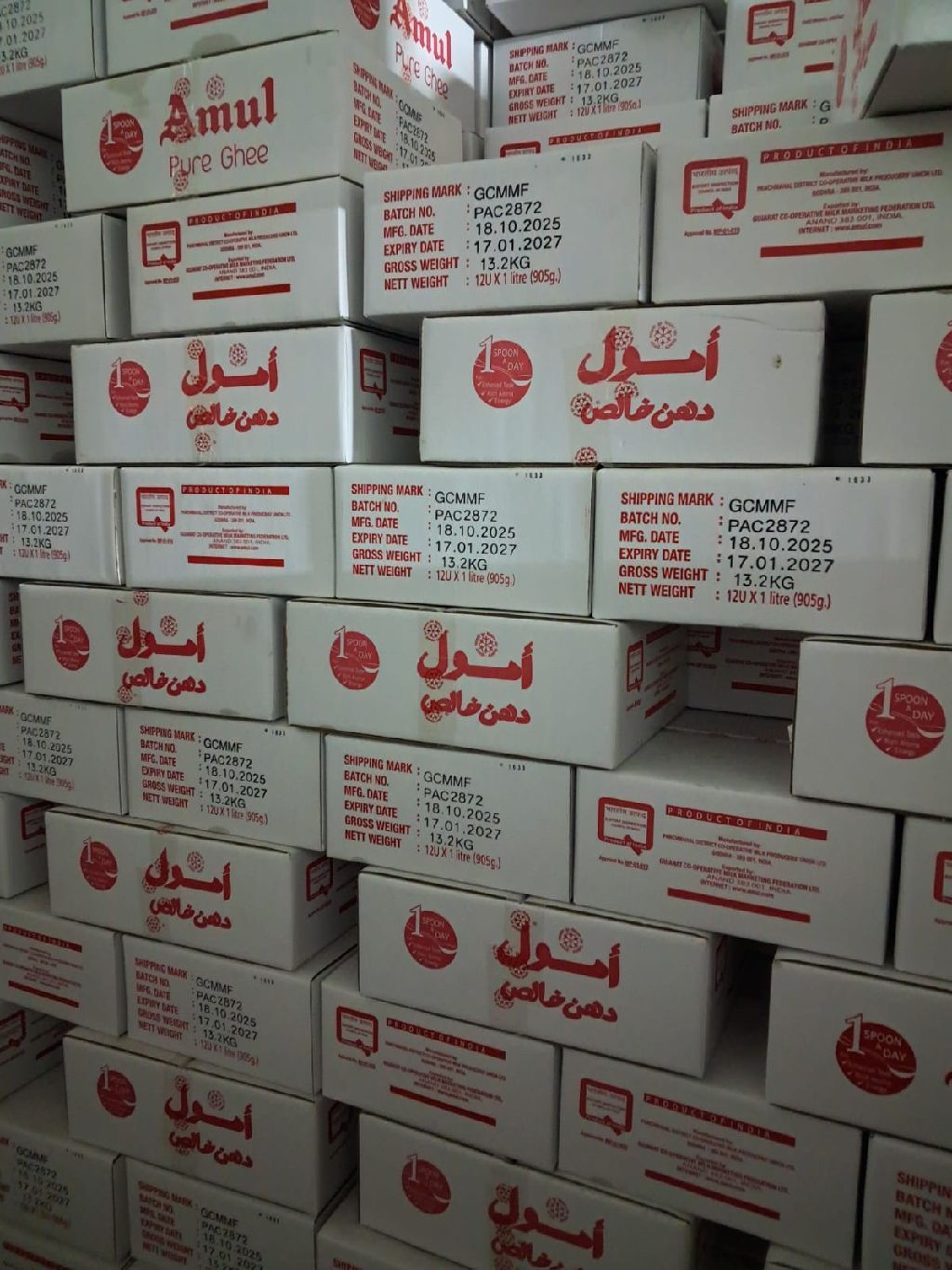 عرض جملة - دهن خالص أمول الأصلي متوفر لدينا كميات جاهزة للتسليم من أمول دهن خالص - صناعة هندية أصلية العبوة 12*1 لتر (905 جيم للحبة) الوزن الاجمالي للكرتون 13.2 كجيم تواريخ انتاج حديثة منتج مطلوب بقوة في السوق مناسب للمطاعم والمخابز وتجار الجملة جودة عالية وطعم ثابت تعبئة رسمية ومواصفات واضحه