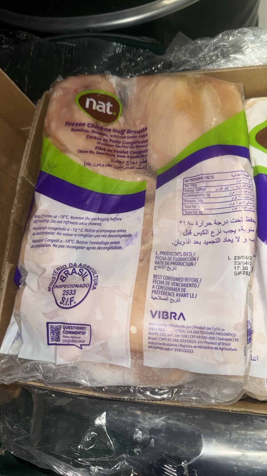 Product CHICKEN BREAST BONELESS SKINLESS, NAT brand. 2,5KG X 4 BAGS PER BOX, 10KG Volume 7 tons Expiry May/ 2026