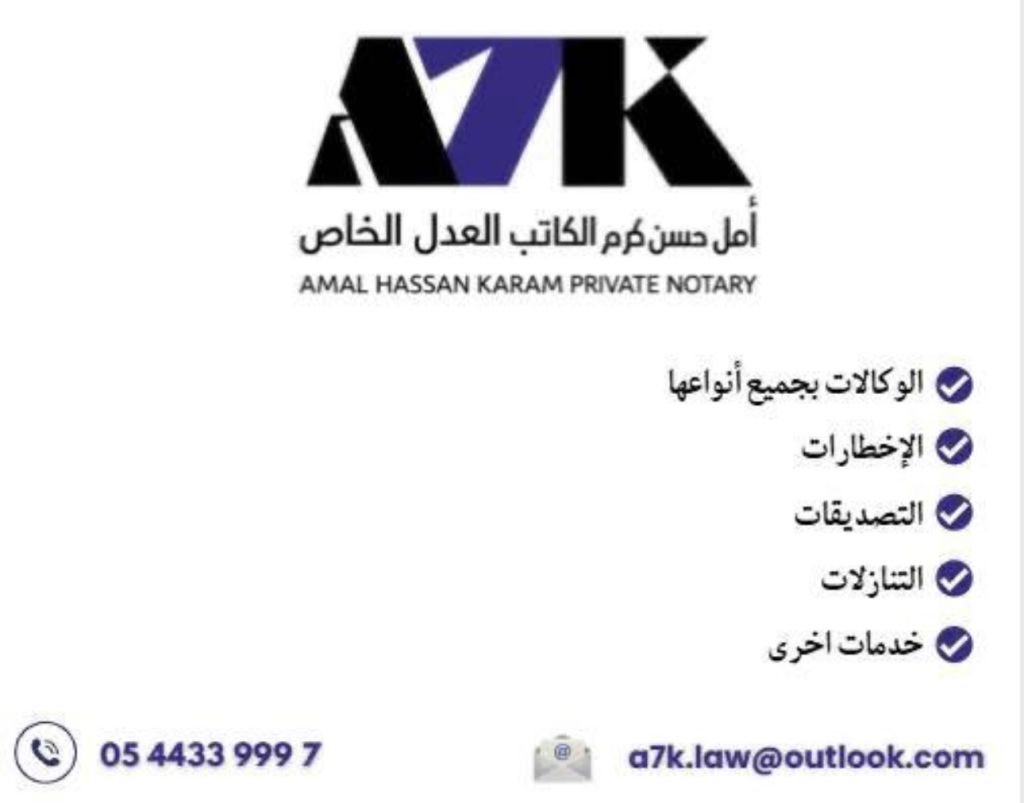 أمل حسن كرم لخدمات الكاتب العدل الخاص خدماتنا تشمل الوكالات بجميع أنواعها - التنازلات - الأخطارات - التصديق - بخدمتكم في أي وقت. للاستفسار والتواصل