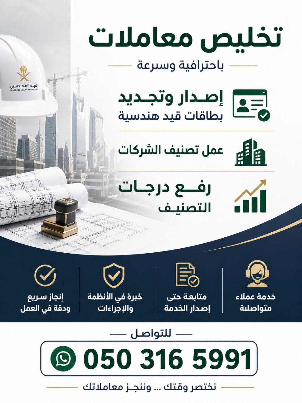 تخليص معاملات باحترافية وسرعة اصدار وتجديد بطاقات قيد هندسية عمل تصنيف الشركات رفع درجات التصنيف انجاز سريع ودقة في العمل خبرة في الأنظمة والاجراءات متابعة حتى اصدار الخدمة خدمة عملاء متواصلة للتواصل نختصر وقتك وننجز معاملاتك
