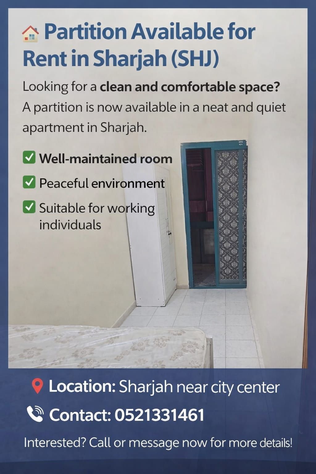 بارتشن شامل مع بلكونه غرفة ماستر. شارع الوحدة قريب سيتي سنتر الشارقة. 1300 شامل كل الخدمات