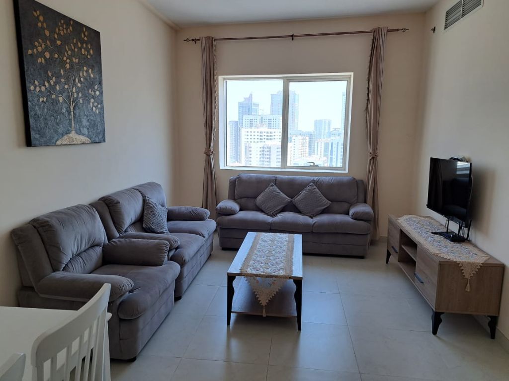 شقة غرفة وصالة 2 حمام للإيجار الشهري في التعاون الشارقة مفروشة فرش كامل بالكونة وتكييف مركزي مسبح مكان ألعاب اطفال تشطيبات ممتازة تفاصيل الدفع مطلوب 4000 شهريا شامل الانترنت فقط التأمين مسترد عند الخروج