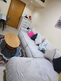 A room and a hall in Al Khan, Sharjah, clean furniture, ready, large area, balcony, distinguished location, 4500 dirhams, including internet, water, electricity, gas, and all bills