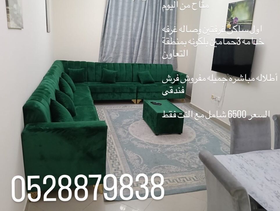 متاح من اليوم أول ساكن غرفتين وصالة غرفة خادمة 3 حمامات بلكونه بمنطقة التعاون اطلالة مباشرة جميله مفروشه فرش فندقي السعر 6500 مع النت