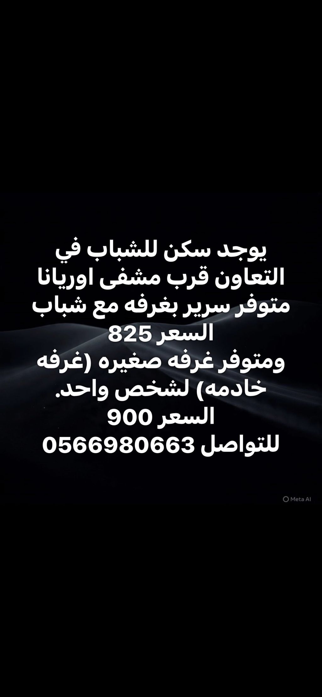 يوجد سكن للشباب في التعاون متوفر سرير بغرفة مع شباب السعر 825 ومتوفر غرفة صغيرة (غرفة خادمة) لشخص واحد. السعر 900 للتواصل