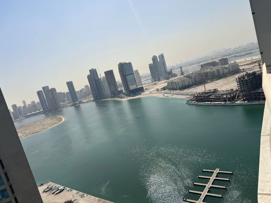 For monthly rent, the most beautiful two - bedroom apartment with a living room in Sharjah featuring a balcony with a distinctive sea view, natural ventilation, and natural lighting. Hotel - style furnished and ready for immediate move - in. The rent includes internet service. Very close to the exit to Dubai and close to all essential services