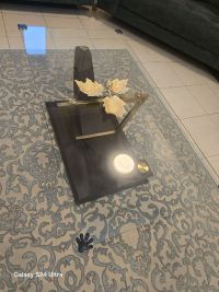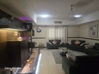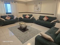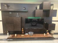 طقم صالون 10 مقاعد لون زيتي قماش ممتاز مع مكتبة حائط وطاولة بلور