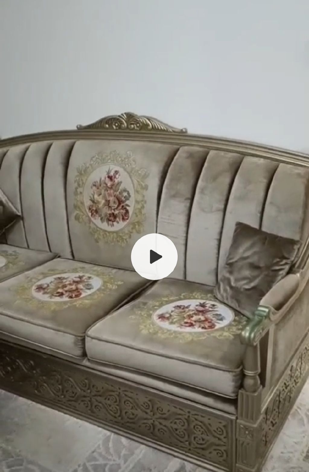 A seating set consisting of two sofas and a three - seater unit with a table and a large nightstand, hand - carved and made of beech wood