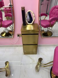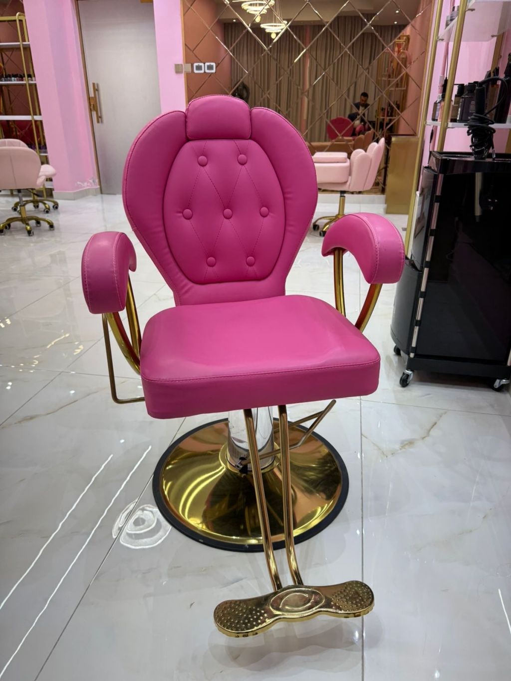 Women’ salon chair in a soft pink color, featuring a modern and elegant design. Upholstered with high - quality, smooth material for maximum comfort, with luxurious gold accents. Perfect for beauty salons, adding a chic and feminine touch to any space