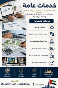 خدمات عامة هل تبحث عن الدقة والجودة في انجاز أعمالك نوفر لكم خدمات متنوعة باحترافية عالية وسرعة في التنفيذ خدماتنا تشمل خدمات عامة ترجمة مستندات (عربي - انجليزي) ادخال البيانات وتنظيمها بدقة تصميم مقاولات ولاند سكيب التسعير واعداد جداول الكميات (BOQ) تصميم اعلانات احترافية دقة عالية في العمل الالتزام بالمواعيد أسعار منافسة خبرة في السوق الاماراتي للتواصل