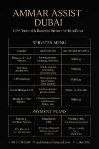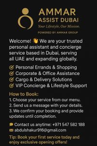 Ammar Assist Dubai - Your trusted personal and business assistant. We handle errands, deliveries, shopping, and corporate tasks with speed, professionalism, and care. Reliable service across Dubai, available 7 days a week. Call + Ammar Assist Dubai - Vision. Strategy. Success