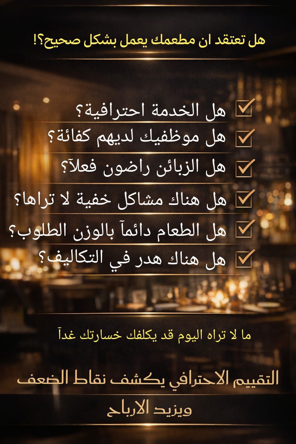 لديك مطعم ولا تعلم كيف يعمل هل تعرف لماذا لا يعود بعض الزبائن، هل تقييماتك تعكس الحقيقة، هل فريقك يعمل بنفس المستوى عند غيابك، هل المطبخ يعمل تحت الضغط بكفاءة، هل هناك مشاكل بين الصالة والمطبخ، هل هناك خسائر يومية لا تنتبه لها، هل تجربة الزبون تساوي توقعاته، نحن نظهر لك جميع المشاكل التشغيلية التي يواجهها مطعمك بكل شفافية ومصداقية قبل فوات الأوان