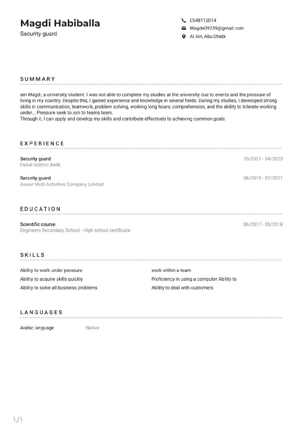 أنا مجدي شاب سوداني 24 سنة متواجد داخل الامارات ابحث عن وظيفة حارس أمن ولدي شهادة خبرة سنتين في المجال