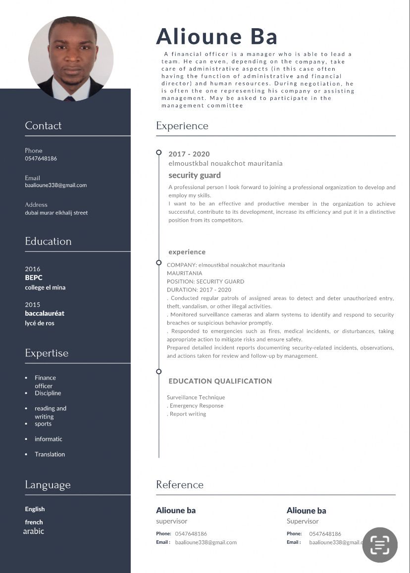 Resident in Dubai, free residence, loanable, Mauritanian nationality, Muslim, religion, looking for a job, companions, preferably from UAE citizens, good physical health, honest, reliable in any circumstances, experience in securing private places and personalities, whatever they are
