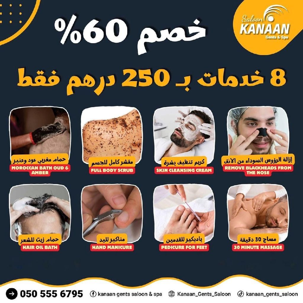 Book your appointment now before the offer ends Special offers at Canaan salon in Abu Dhabi, Khalifa City A at very competitive prices. Enjoy a refreshing and relaxing winter experience with a royal Moroccan bath including steam, oud and amber scrub, and 8 services in the first offer or 9 services in the second, as shown in the image above. Contact us now