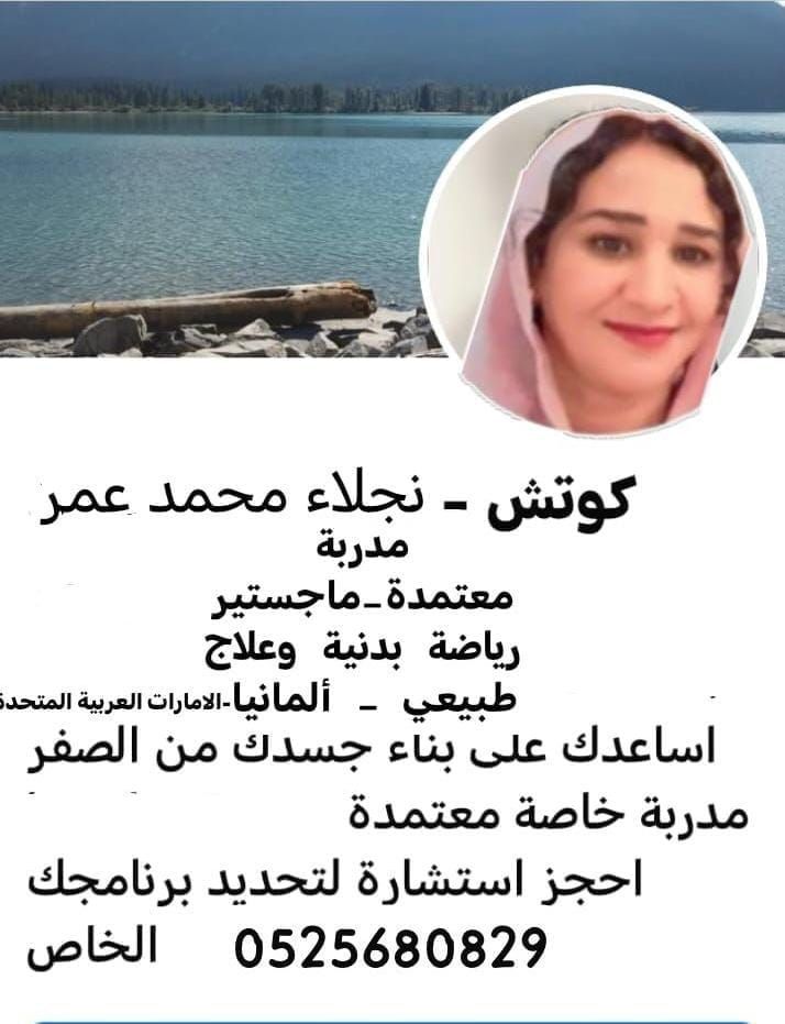 I am Coach Najla Mohammed Omar Private Trainer Master Germany Residing in UAE I care about taking care of your body from scratch Swimming Body Lifting exercises Slimming Fattening Physiotherapy Special Consultations