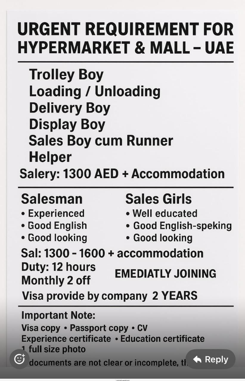 Supermarket Staff - Job Description in Sharjah - Abu Shagara Male/ Female Position Supermarket Assistant/ Store Associate Location Supermarket/ Grocery Store Employment Type full time/ part time Job Summary We are looking for friendly and reliable supermarket staff to assist with daily store operations. The role includes helping customers, stocking shelves, handling payments
