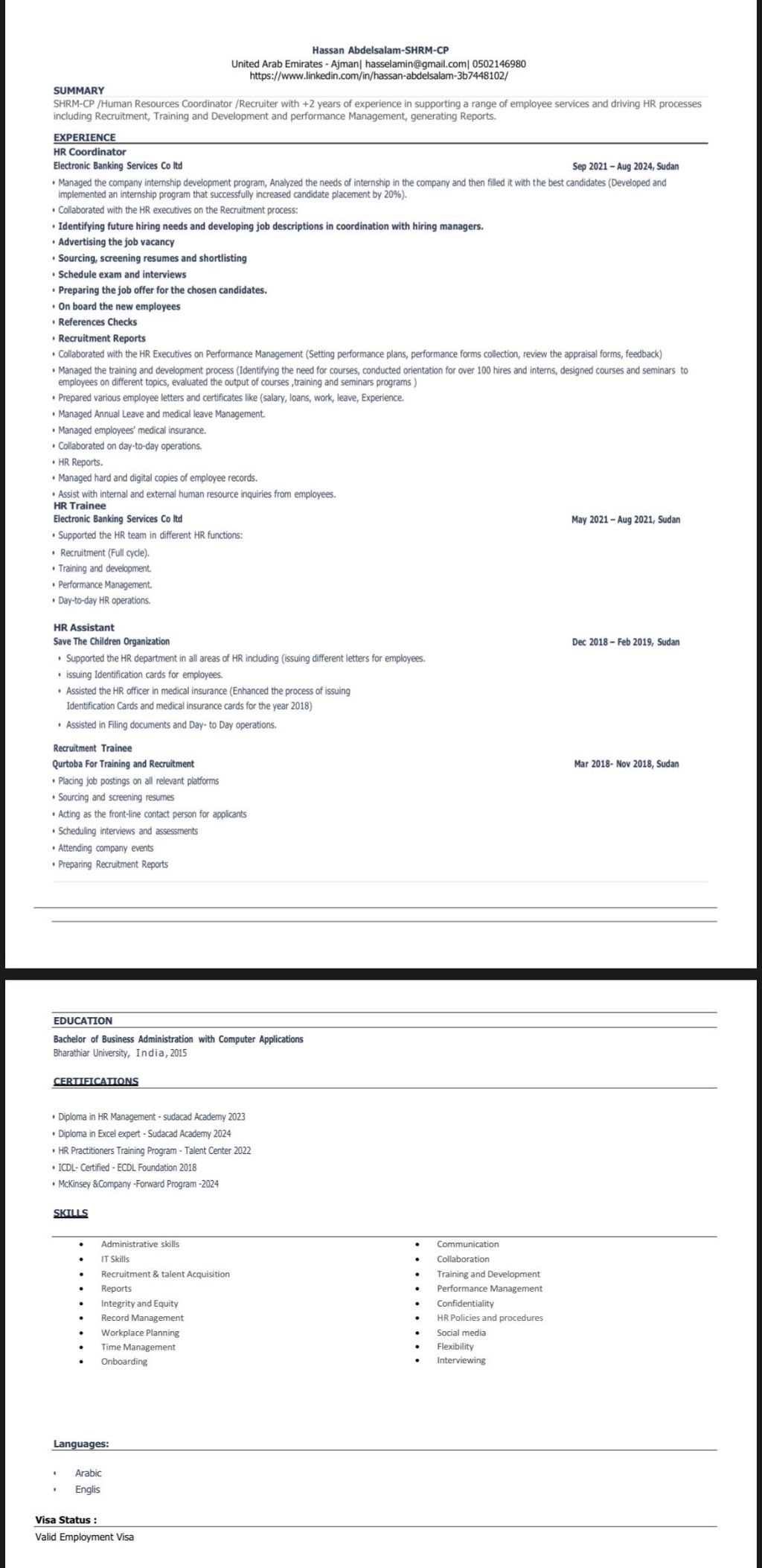 A SHRM - CP HR Coordinator with experience in HR over 2 years in recruitment, training and development, performance management and administrative support looking for a job in HR