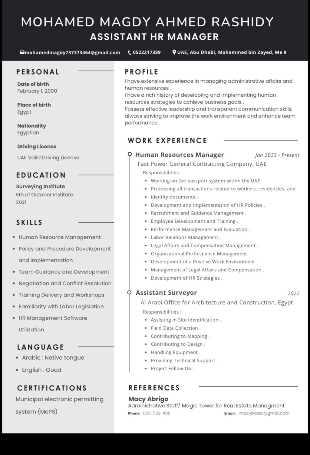 HR Officer with 3 years of experience in Abu Dhabi at a contracting company. Skilled in employee affairs, personnel files, government transactions, contract renewals, visa processing and renewals. Good knowledge of UAE Labour Law and handling labor issues. Able to work under pressure. UAE driving license holder and ready to join immediately