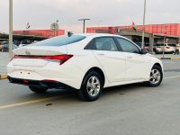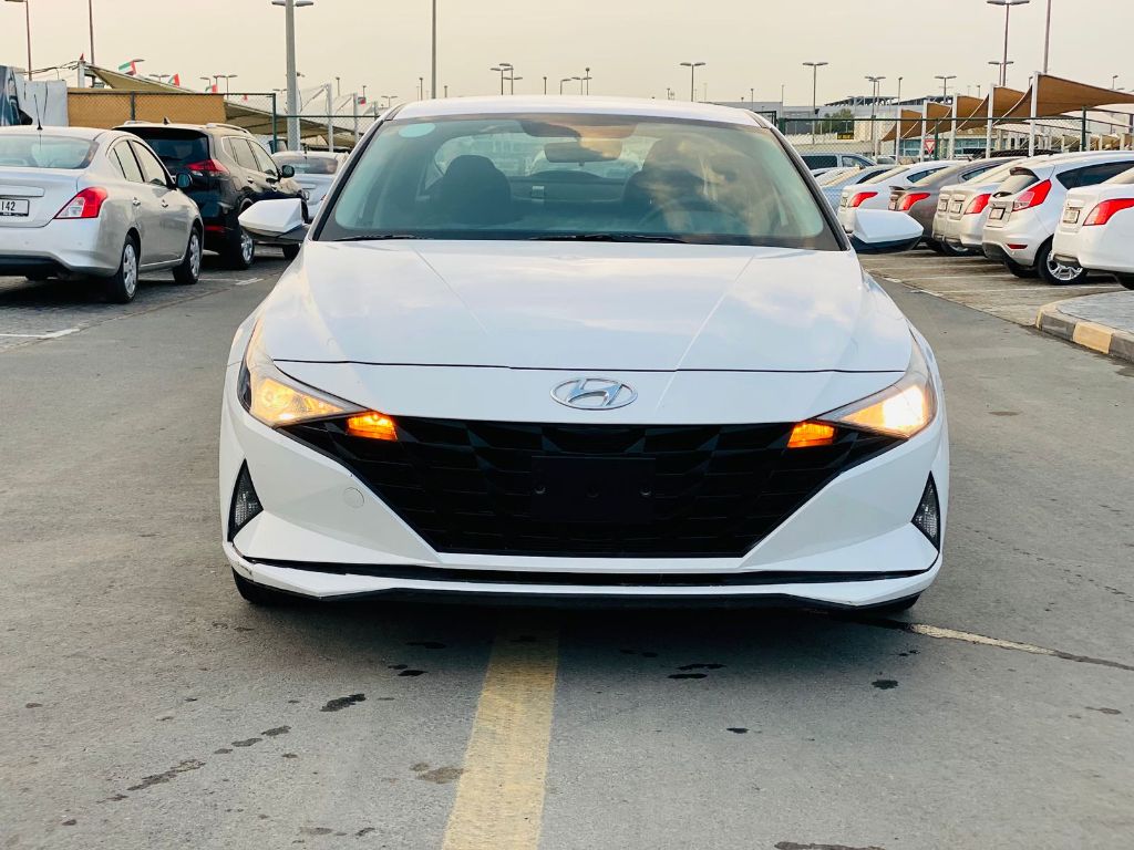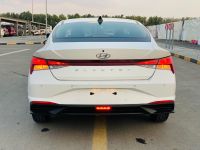 Hyundai Elantra GCC 2023, 4-cylinder 1.6L engine, approximately 127 HP. Exterior color: White. Interior color: Black. Features: Cruise control, steering controls, alloy rims, front & rear fog lights, LED lighting, rear parking sensors, screen.