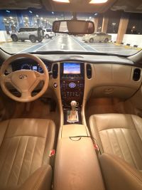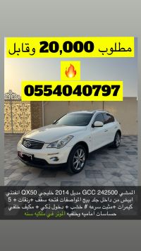 انفينيتي QX50 موديل 2014 خليجي GCC، الممشى 242,500 كم، لون أبيض من الخارج وجلد بيج من الداخل. المواصفات تشمل: فتحة سقف، رنقات، 5 كاميرات، مثبت سرعة، خشب، دخول ذكي، مكيف خلفي، حساسات أمامية وخلفية. المحرك في ملكية سنة.