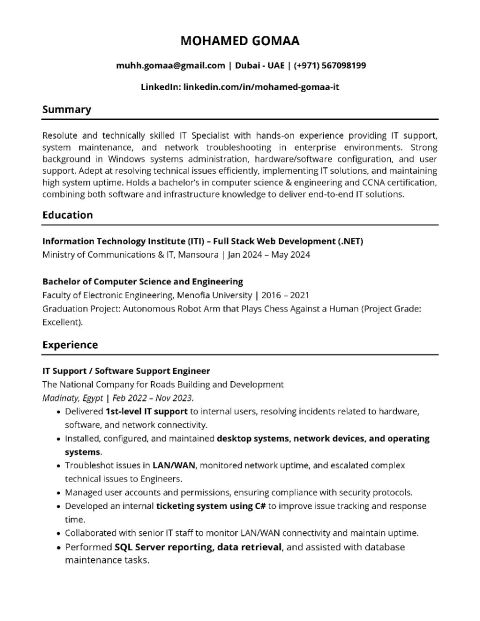 أكتب اليكم لأعرب عن اهتمامي بوظائف دعم تقنية المعلومات المتاحة. بفضل خبرتي الواسعة في الدعم الفني، وإدارة الأنظمة، واستكشاف الأخطاء وإصلاحها في بيئات مختلفة، فأنا واثق من قدرتي على دعم المستخدمين، وصيانة الأنظمة، وحل المشكلات بكفاءة. لدي خبرة في بيئات ويندوز، وإدارة أوفيس 365، واستكشاف أخطاء الاجهزة والبرامج وإصلاحها، ودعم الشبكات، أنا متواجد على الفور وعلى استعداد للانتقال الى أي مكان في الامارات