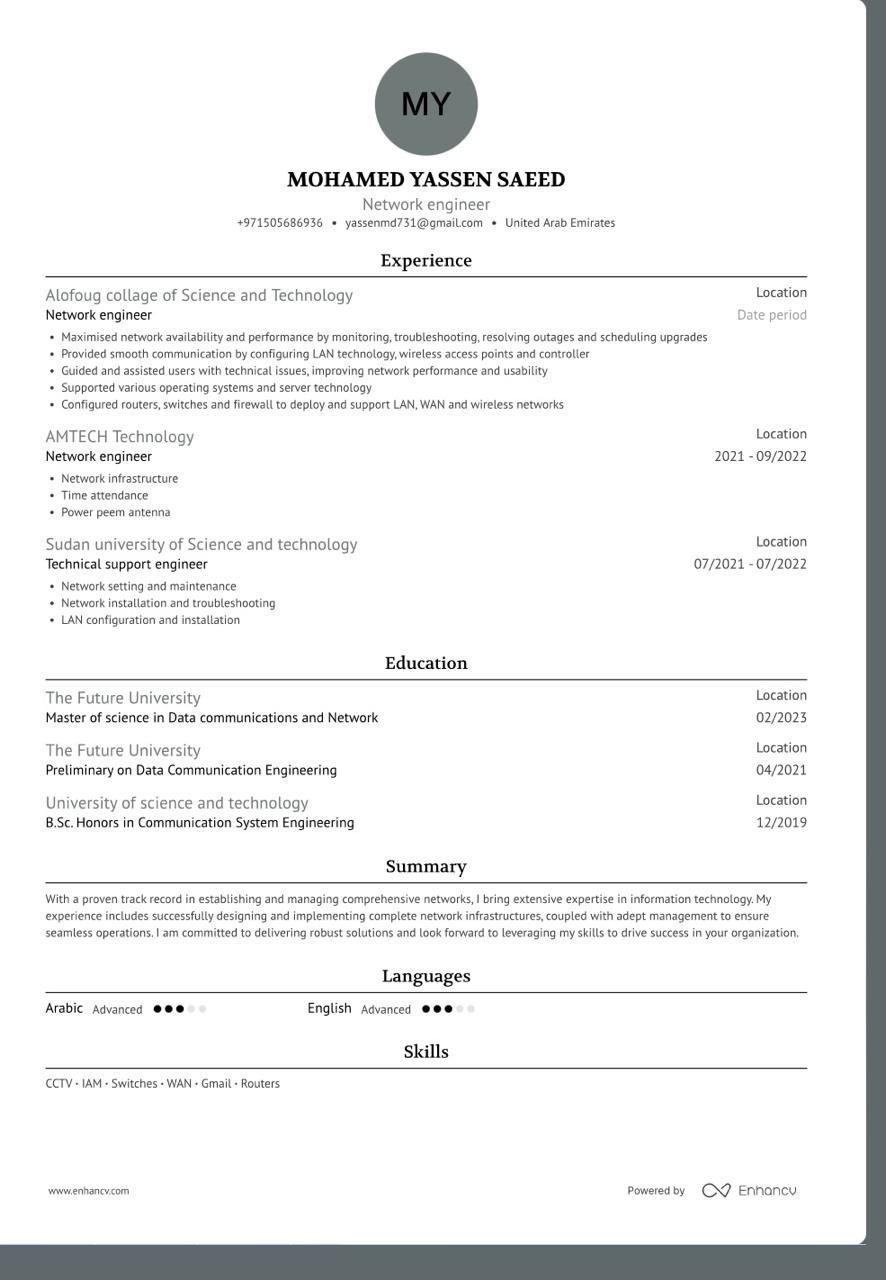 متخصص في تقنية المعلومات وهندسة الشبكات وادارتها والبنيه التحتية وأنظمة المراقبه CCTV وأنظمة ERP وحل المشكلات التقنية اليوميه لضمان استقرار وأمان الأنظمة لدي خبرة خمس سنوات في تصميم الشبكات والدعم الفني وصيانة الاجهزة مع قدرة عالية علي التعامل مع الأعطال بكفاءة وسرعة جاهز للانضمام فورا الى فريقكم