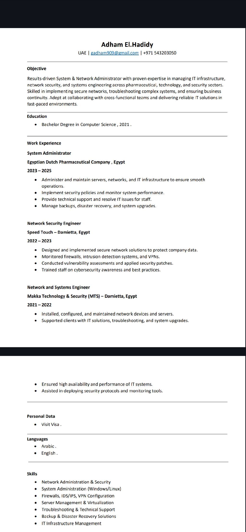 مهندس شبكات وأنظمة IT بخبرة أكثر من 4 سنوات في شبكات Cisco، الجدران النارية (Firewall) وإدارة Windows Server. خبرة قوية في LAN / WAN/ VLAN/ VPN وActive Directory وDNS وحل مشاكل الشبكات والأنظمة. متاح للعمل فورا وجاهز للمقابلات