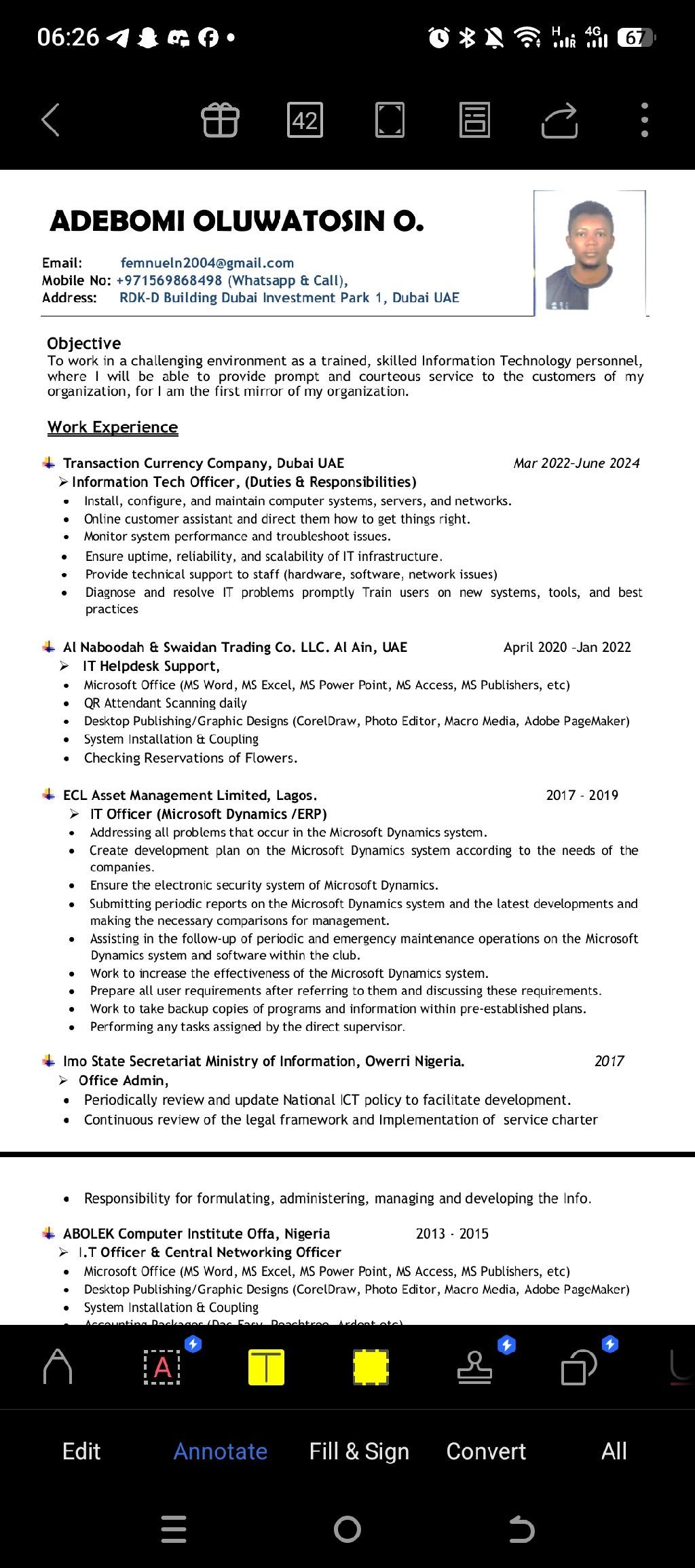 عملت كموظف تقنية معلومات (IT) في شركة عقارية في دبي. لدي خبرة 8 سنوات في دولة الامارات العربية المتحدة، وأحمل إقامة خاصة (فيزا خاصة) الراتب المتوقع بين 2500 الى 3000 درهم