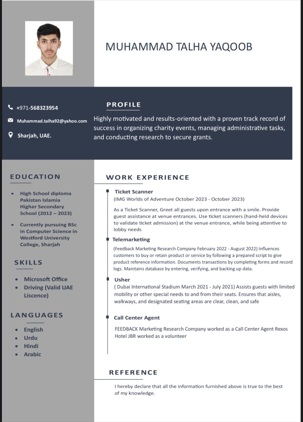 محترف ذو دوافع عالية، بخبرة في خدمة العملاء والتسويق عبر الهاتف وعلاقات الضيوف. أدرس حاليا دبلوم هندسة البرمجيات وبكالوريوس علوم الحاسوب، وأجمع بين الكفاءة التقنية ومهارات التواصل الفعالة. أجيد الانجليزية والأردية والهندية والعربية. أتميز بسرعة التعلم، وأحمل رخصة قيادة اماراتية سارية المفعول، والتزم بتحقيق النتائج