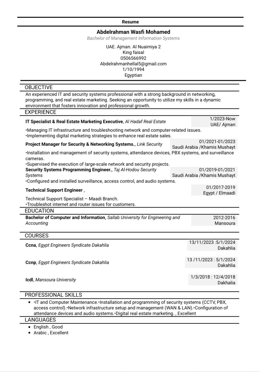 I am Abdelrahman, an Egyptian national with a Bachelor’s degree in Computer Science. I have over 10 years of experience in technical support, networking, and security systems across Egypt, Saudi Arabia, and the UAE. I bring strong problem - solving and system management skills and seek a full time position to grow and add value to the organization