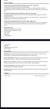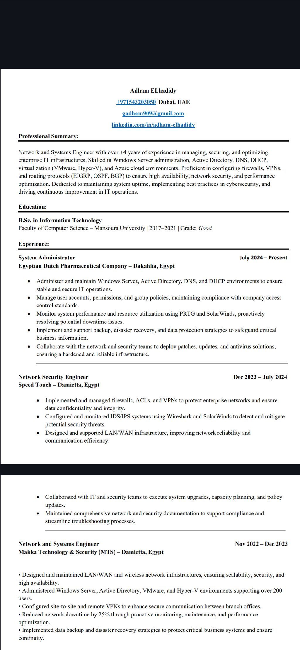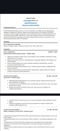 Senior Network & System Administrator IT Engineer Network & System Administrator with 4 + years of experience in Cisco networks, firewalls, and Windows Server administration. Strong skills in LAN/ WAN, VLAN, VPN, Active Directory, DNS, and troubleshooting. Available immediately and ready for interviews
