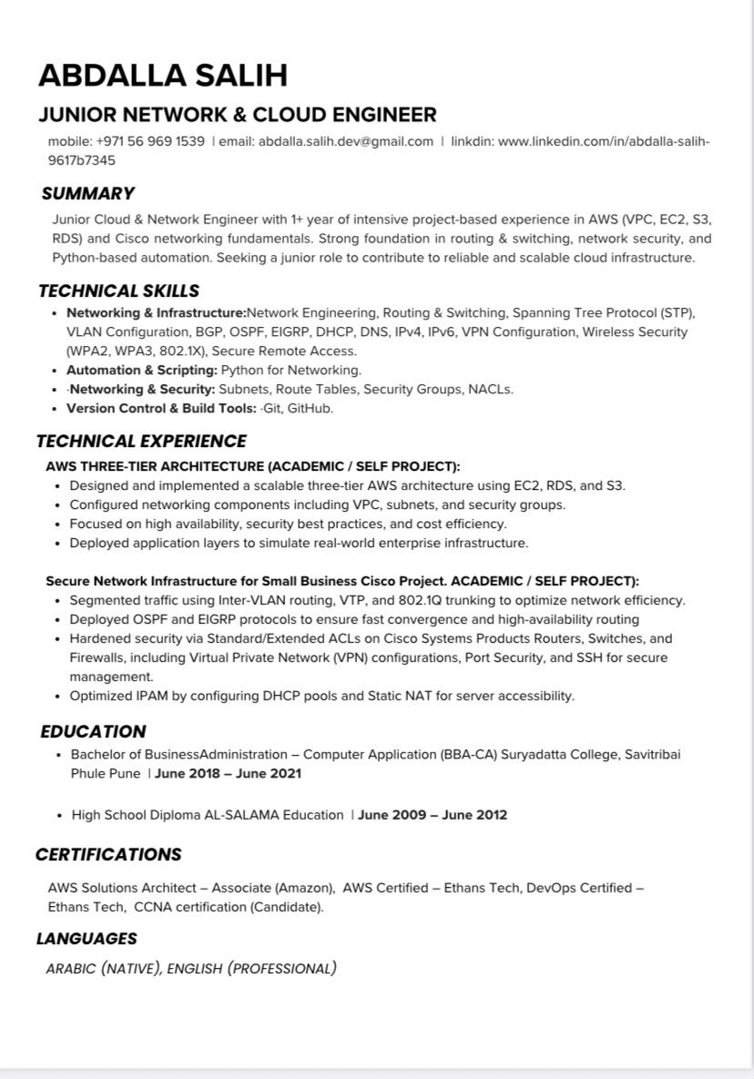 I am Abdullah, a Sudanese citizen, an IT engineer specializing in networks and AWS cloud computing, currently residing in Abu Dhabi. I am looking for a job opportunity to utilize my technical skills and contribute to the development of the organizations’ digital information