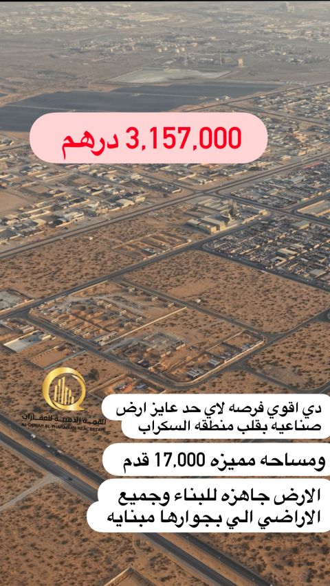 للبيع أرض لقطة ومميزه جدا بموقع استراتيجي بقلب منطقة الا سكراب قطع غيار السيارات بمساحة 17000 قدم تملك حر للعرب و99 سنة للأجانب بسعر نهائي 3157000 درهم