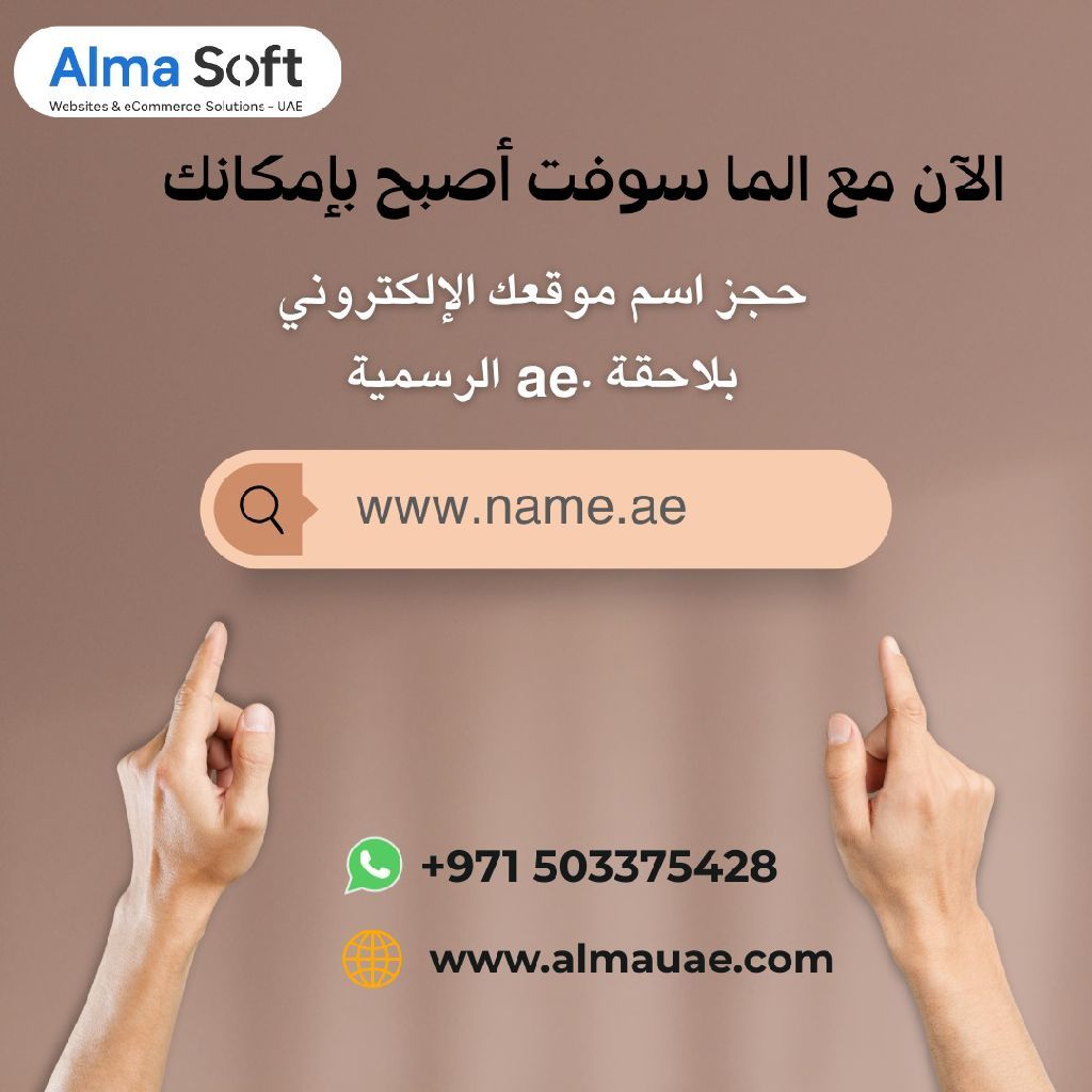 جديد ألما سوفت هل ترغب بامتلاك موقع الكتروني مميز لشركتك أو متجرك في الامارات الآن مع ألما سوفت أصبح بامكانك حجز اسم موقعك الالكتروني بلاحقة. ae الرسمية تصميم احترافي لموقع أو متجر الكتروني يلائم طبيعة عملك حلول متكاملة لزيادة مبيعاتك وانتشارك الرقمي لا تفوت الفرصة، اجعل اسم علامتك التجارية متاحا عبر الانترنت بهوية اماراتية. تواصل معنا اليوم وابدأ رحلتك الرقمية معنا