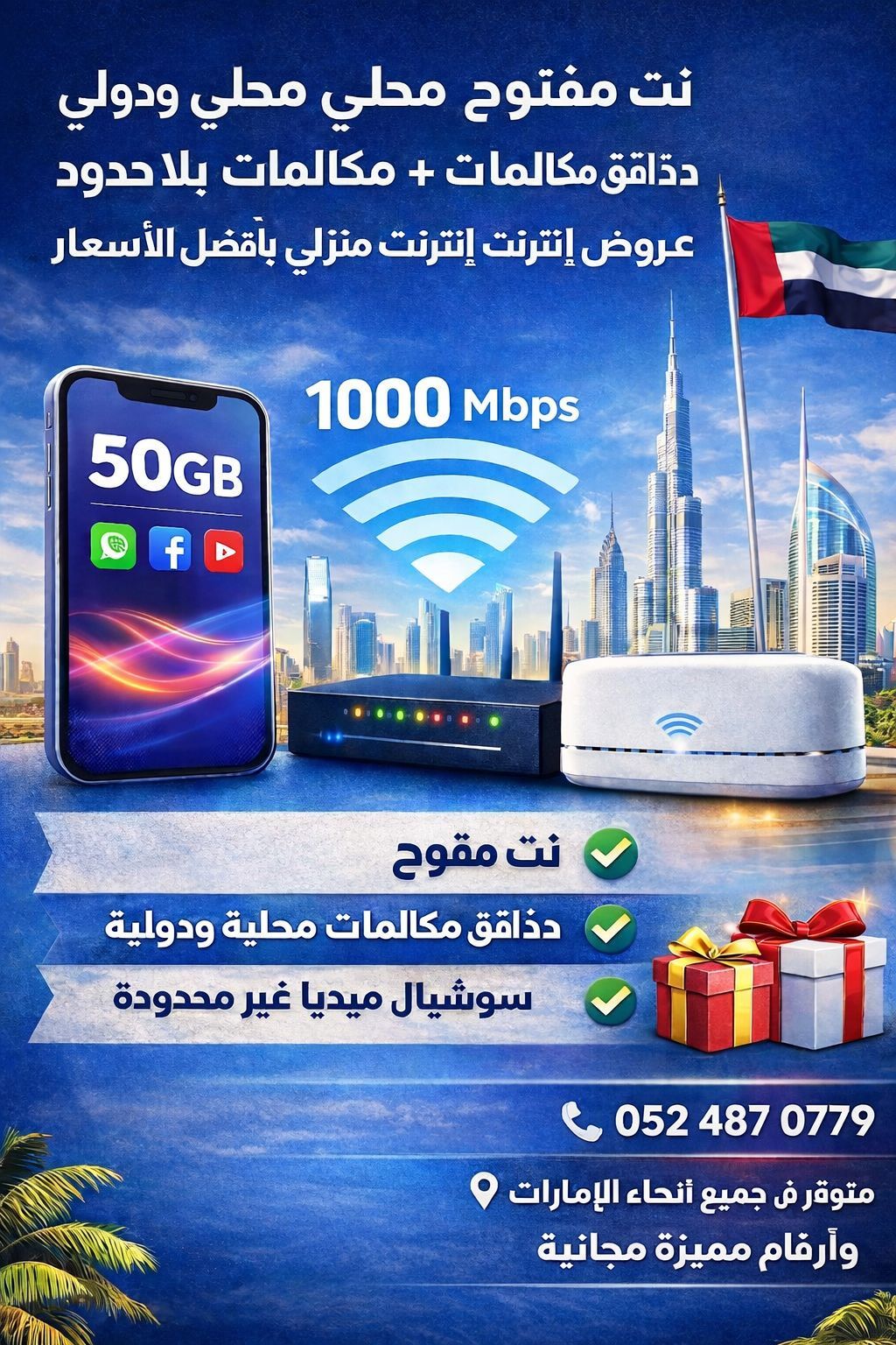 Choose your premium number now 20% - 50% discount on postpaid plans for all du or Etisalat e users Open Internet + Open Calls 30% Off 5G home internet with router and free delivery blazing - fast and exclusive price The possibility of instalment of the phone after two months of activating the plan Continuous follow - up