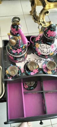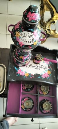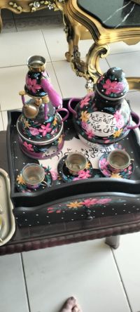 طقم بوكس خاص فيه فناحين قهوة ودلة قهوة وقدر مع مشعل نحاس بحالة ممتازة السعر 200 درهم