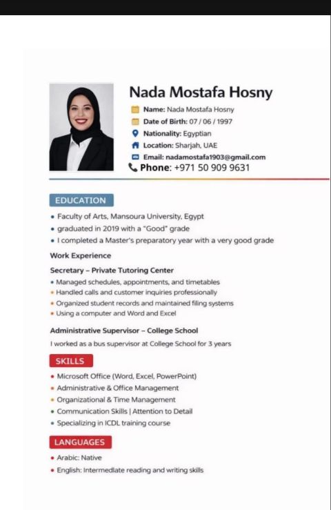 فتاة مصريه 28 سنة خريجه كلية أداب ابحث عن عمل مناسب في مجال السكرتارية أو موظفة استقبال مقيمة في إمارة الشارقة