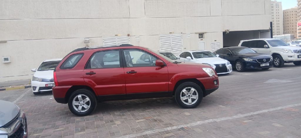 كيا سبورتاج موديل 2009 خليجي، لون أحمر، مواصفات كاملة، بحالة جيدة، عداد الكيلومترات 180,000 كم، السعر 12,500 درهم.