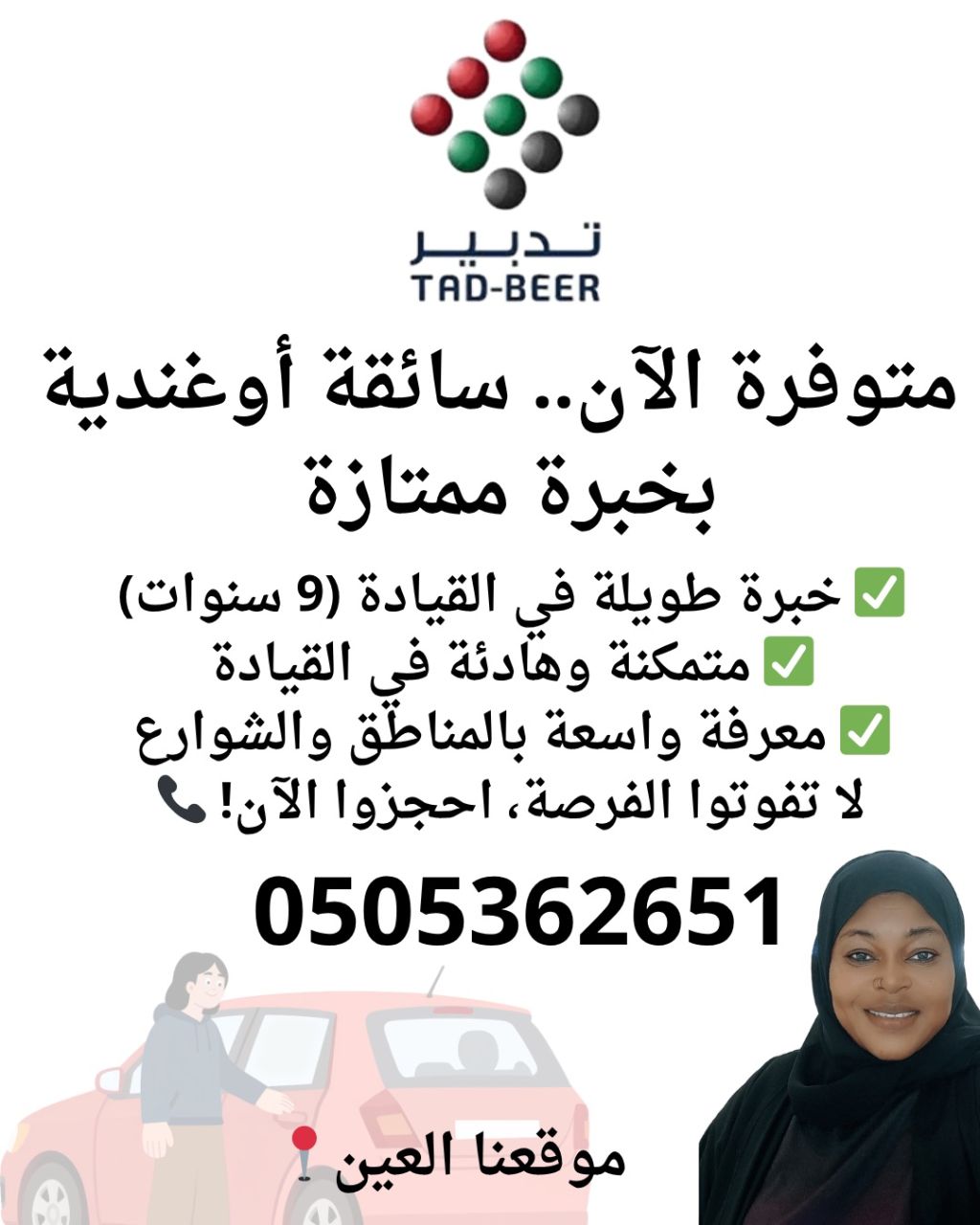 من مركز تدبير رسمي في العين، متوفرة الآن سائقة أوغندية بخبرة 9 سنوات. المميزات تمكن تام في القيادة، هدوء، ومعرفة بالشوارع. الضمانات عقد رسمي سنتين + ضمان شامل + متوفر تجربة. الموقع العين. للتواصل