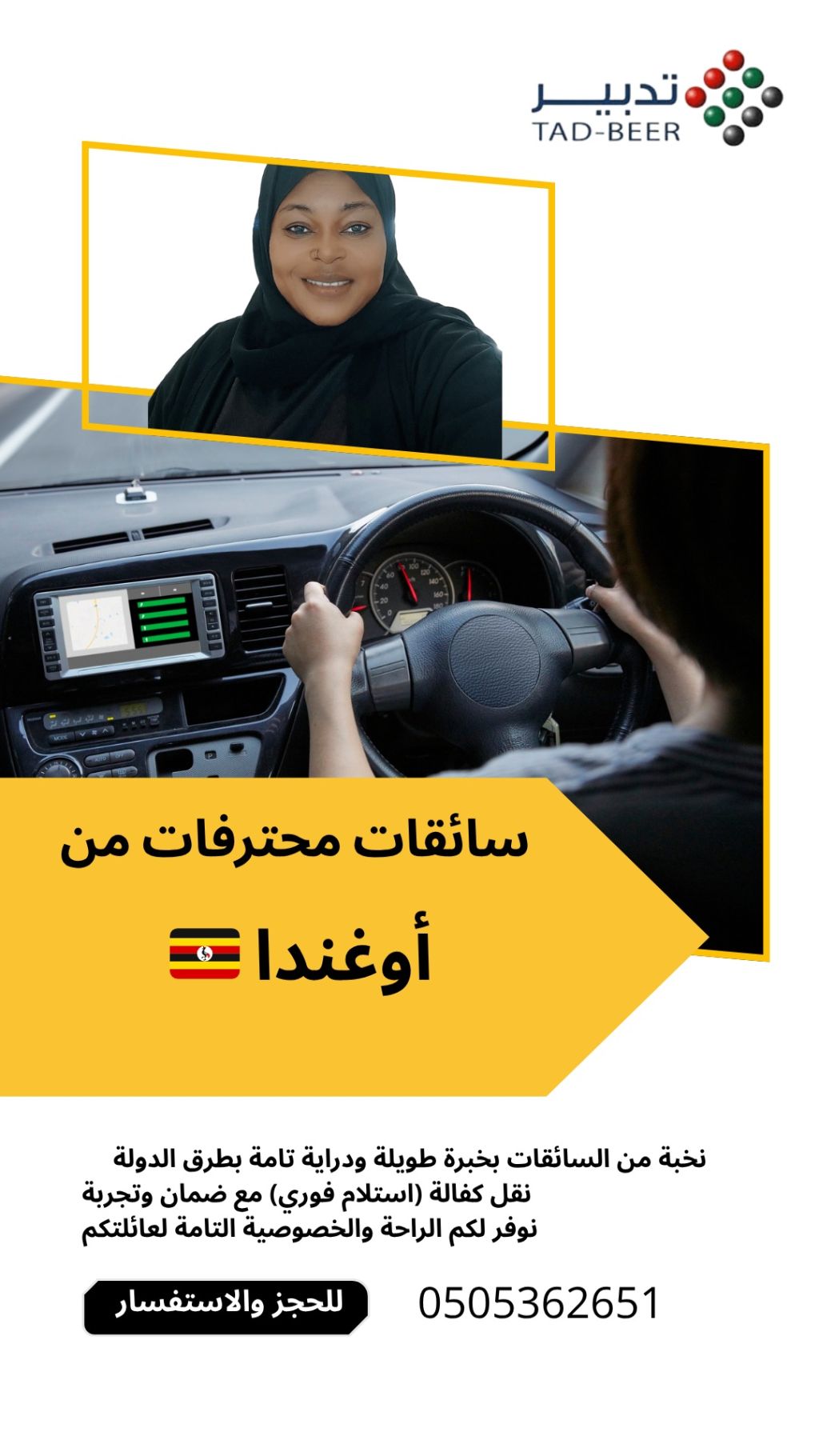 عرض حصري من تدبير نوفر لكم سائقات محترفات من أوغندا بمهارة عالية وخبرة بطرق الدولة. رسوم المكتب 9500 درهم فقط. نقل كفالة استلام فوري. المميزات خبرة طويلة، ضمان وتجربة، وخصوصية تامة لعائلتكم. للحجز والاستفسار
