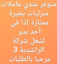 متوفر عندي عاملات منزليات بخبرة ممتازة تنظيف طبخ ورعاية الاطفال تنظيف صالون شغل وقت كامل عقود شهرية أو سنوية أو بساعات يوميات أو دفع بشهر كما يوجد عمال أيضا للخدمات الأخرى مثل عمال دليفري وتنظيف مزارع شغل شركة غسيل سيارات تنظيف داخل المستشفى مطعم حديقة وغيرها