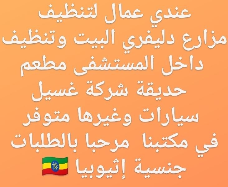 عندي عاملات منزليات بخبرة ممتازة تنظيف طباخه رعاية الاطفال تنظيف صالون شغل باس المدرسة وغيرها وقت كامل عقود شهرية أو سنوية أو بساعات يوميات دفع بشهر كما يوجد عمال أيضا للخدمات الأخرى مثل عمال دليفري وتنظيف مزارع شغل شركة غسيل سيارات تنظيف داخل المستشفى مطعم حديقة وغيرها