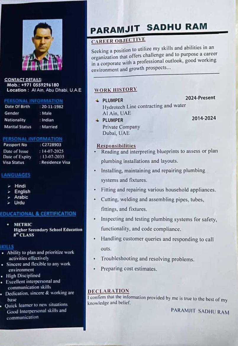أنا شخص مبدع في صيانة المباني وترميم وتجهيز وتأسيس شبكة المياه والصرف الصحي من البداية الى النهاية وعندي خبرة في أكثر من شركة واشتغلت في مدينة العين ودبي للتواصل
