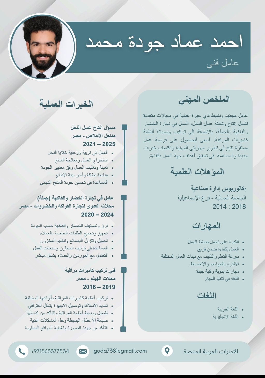 عامل نشيط ومجتهد لدي خبرة في مجالات متعددة تشمل انتاج عسل النحل، العمل في تجارة الخضار والفاكهة بالجملة، وتركيب كاميرات المراقبة. أسعى للحصول على فرصة عمل مستقرة لتطوير مهاراتي وزيادة خبرتي