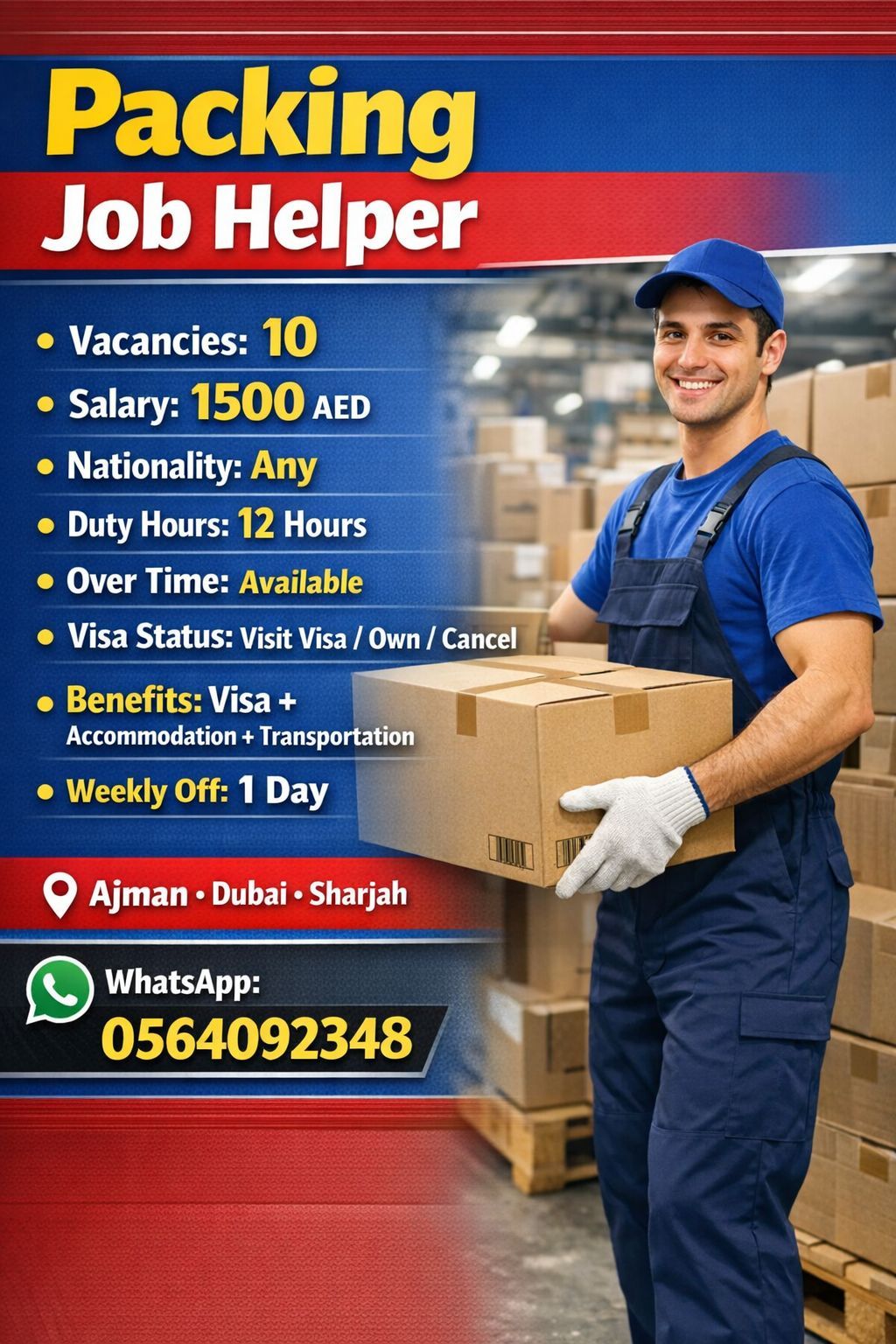 High power management company Hiring employment for Packing jobs in Sharjah ALQASIMIA Need helper Vacancies jobs available Packing helper Store keeper helper Sales helper Cleaner Gender male/ Female Nationality Any nationality Duty Hours 12 hours Overtime Available Salary AED1500 per month Company office in Sharjah Company branch Dubai Ajman Company provides Visa Acommiddition